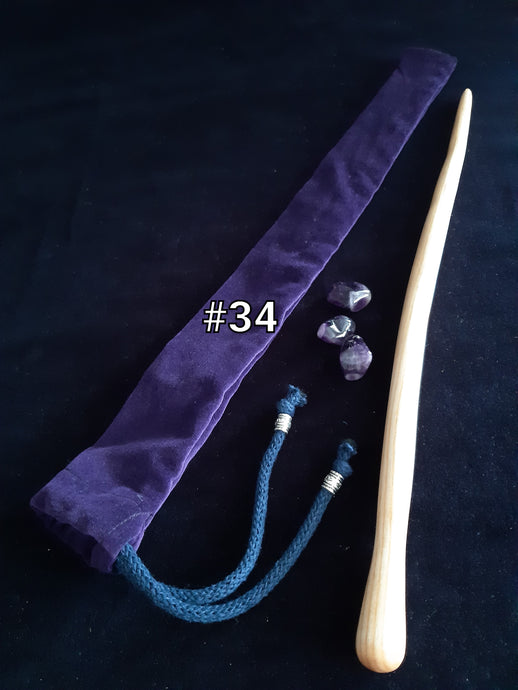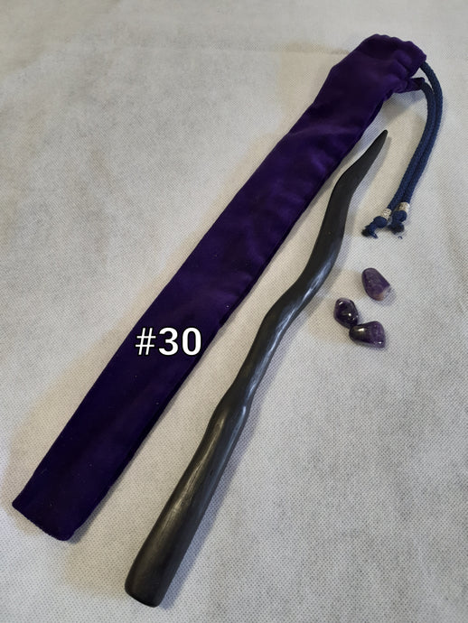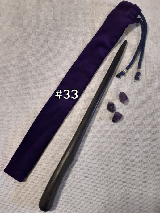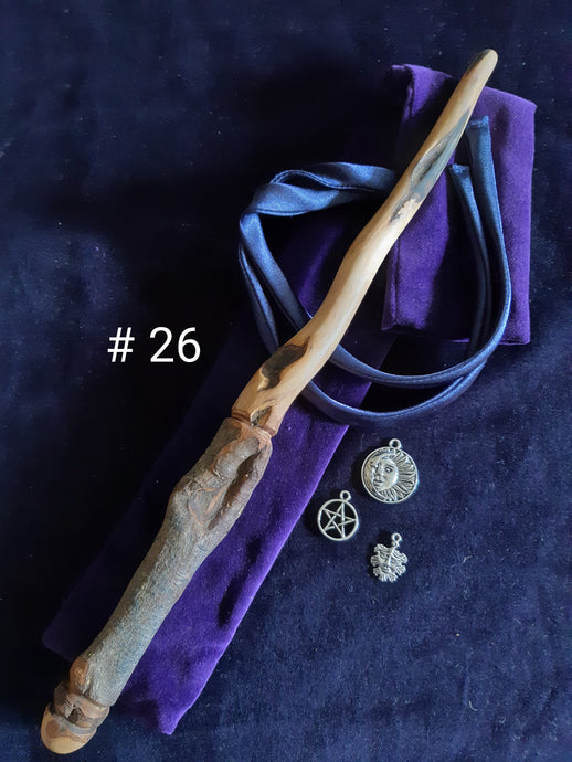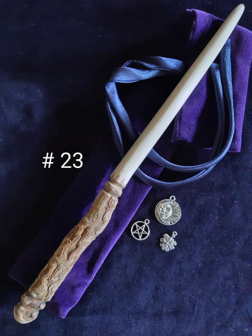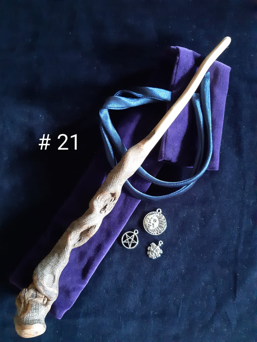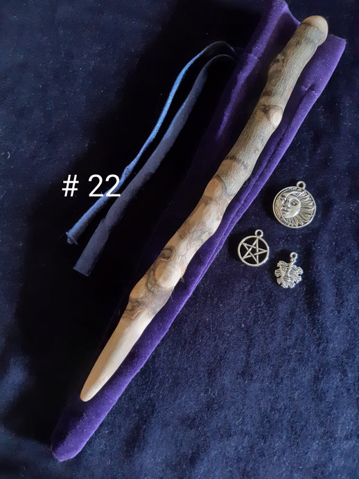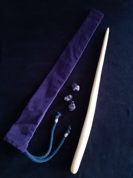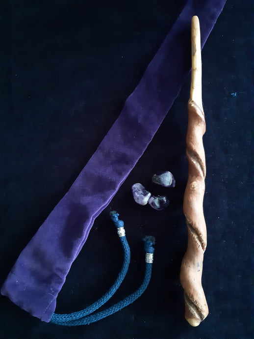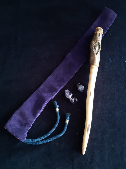 Sculpting a wand by hand is a meditative experience. It requires empathy with the wood, a calm, open mind and intuitive, sensitive crafting - always guided by, and working with the spirit and energy of the tree. Each wand is totally unique, with a natural balance in the hand. They are rubbed with pure beeswax and supplied in their own velvet pouch.